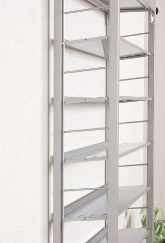 ●ツッパリ時にノブネジを4ヶ所締めるだけ!●おしゃれでスリム奥行わずか16.5cm!●シンプルなメタリック仕上げで見た目もスッキリ!●スチール製で丈夫、天板部分には小物が置ける小棚付き!●棚板の傾斜&仕切り板で上手に収納。